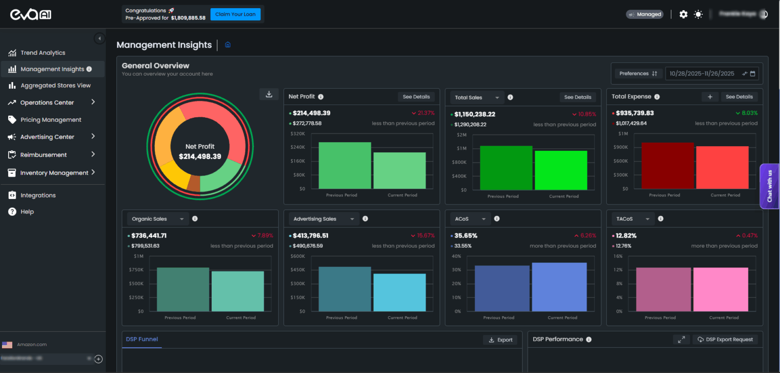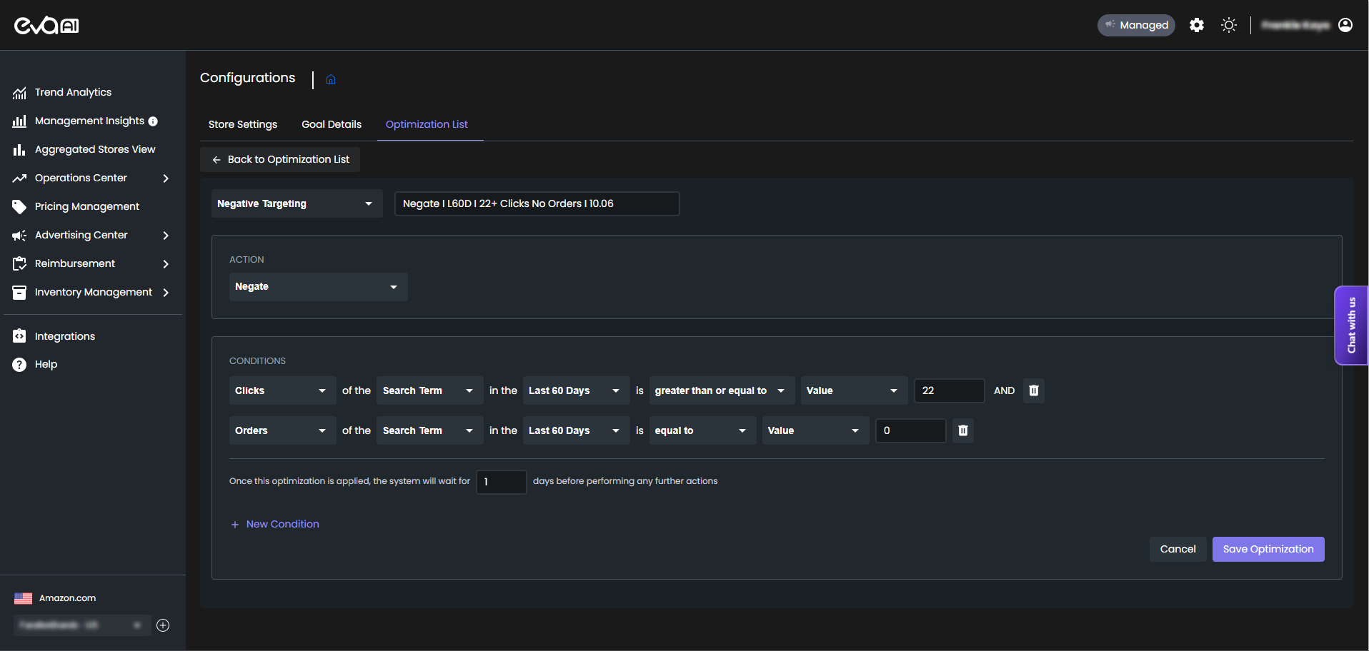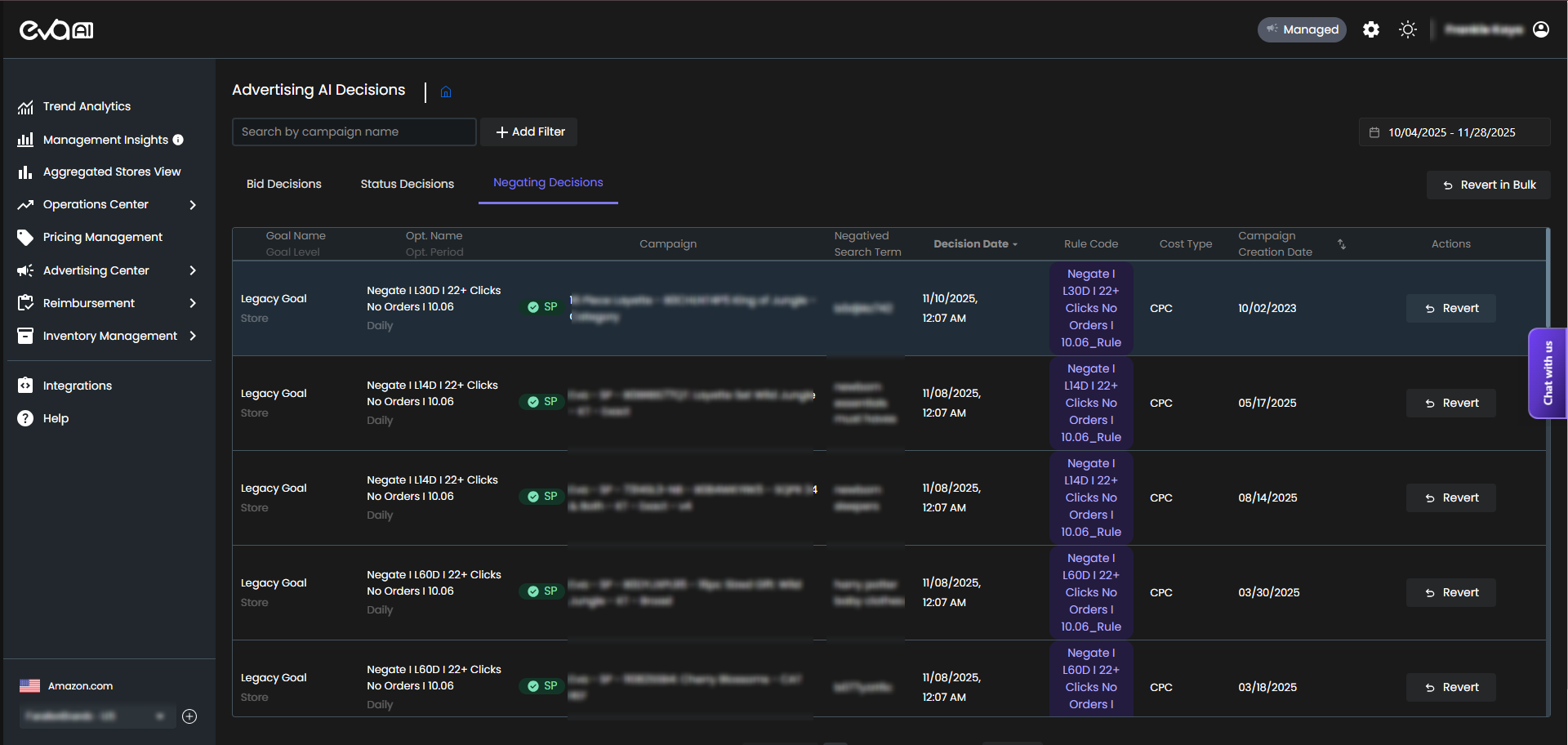 Your AI works the way you want it to. Eva uses an intelligent learning system, but you define the rules and boundaries that shape its behavior. For Keyword Negation, you set the custom thresholds for ACOS, spend, or conversion rates. This gives you the ability to build your own AI system that follows your strategy with complete accuracy. You keep control while the platform handles the execution.